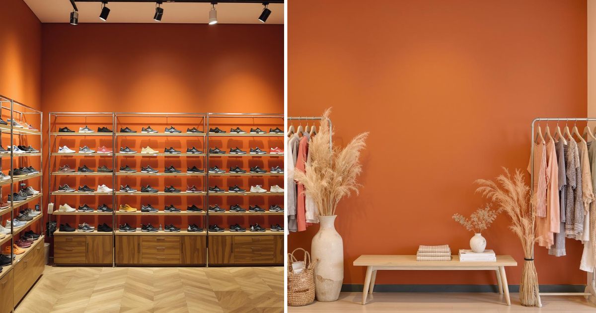 Το θερμό και φιλικό πορτοκαλί χρώμα μπορεί να αποτελέσει ιδανικό φόντο ως τοίχος ή διαχωριστικό πάνελ μέσα στο κατάστημα για ρούχα, ή αξεσουάρ μόδας, αναδεικνύοντας το υπό έκθεση προϊόν.